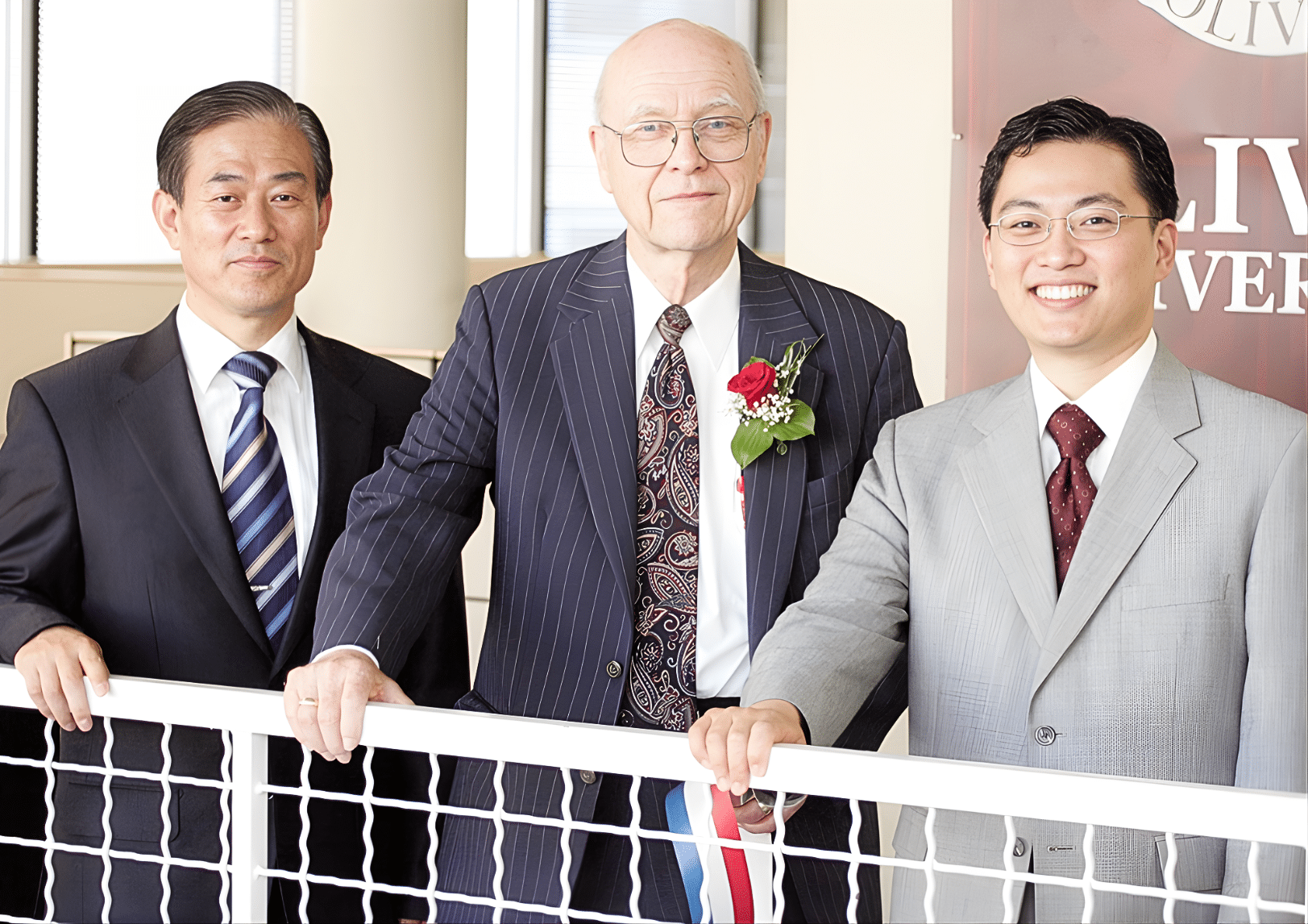 왼쪽부터 장재형 목사(올리벳대학교 설립자·International President), 랄프 D. 윈터 박사(올리벳대학교 명예이사장·U.S. Center for World Mission 설립자), Andrew Lin 박사(올리벳대학교 이사회 의장). 올리벳대학교 캠퍼스에서.